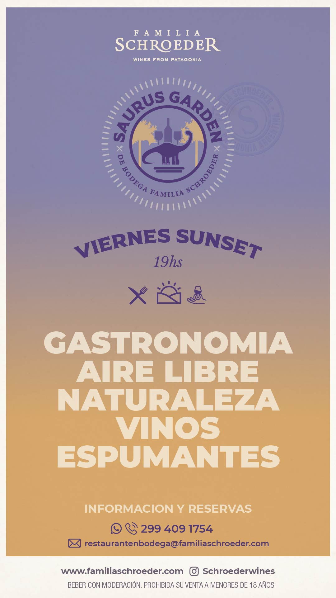 Saurus Garden: Viernes, Sábados y Domingo y Feriados de 12:00 a 15 hs.. Reservas: 0299-15409 1754 / restaurantenbodega@familiaschroeder.com